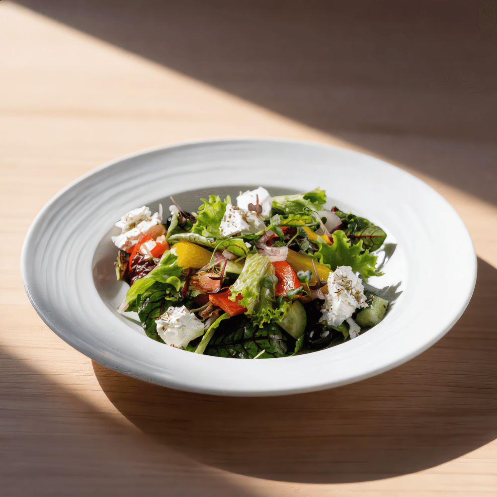 Помидор, огурец, болгарский перец, лук ялтинский, микс салата, маслины, сыр фета, оливковое масло, соевый соус, лимонный фреш, орегано
