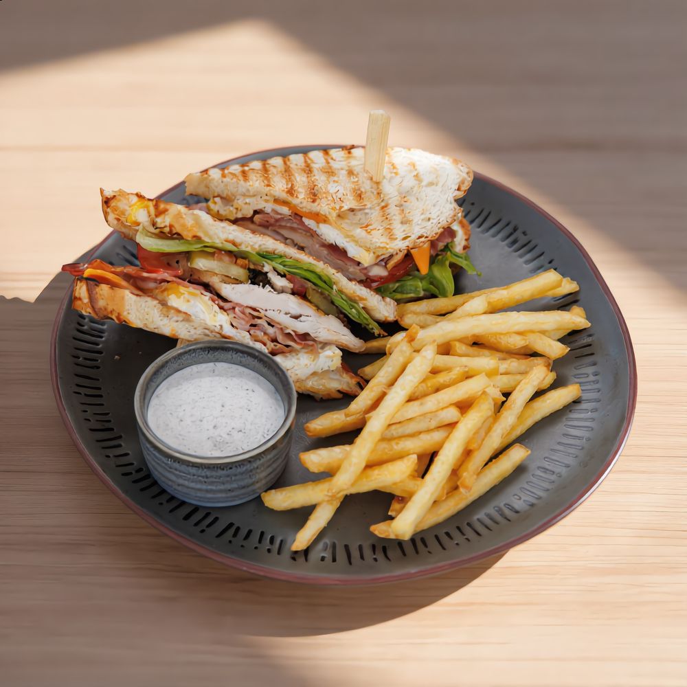 Ромен, помидоры, маринованный огурчик, сыр чеддер, соус ''цезарь'', подается с картофелем фри и трюфельным соусом