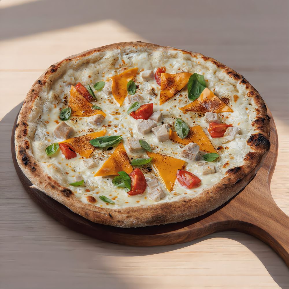 Сливочный соус "Бьянка" с рикоттой, сыр моцарелла, сыр чеддер, куриная грудка, черри, базилик, орегано